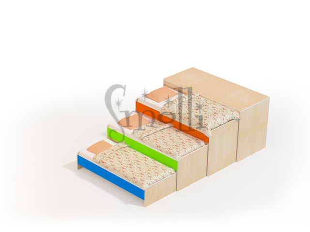 Кровать первого, второго и третьего уровня установлена на выкатные ролики.